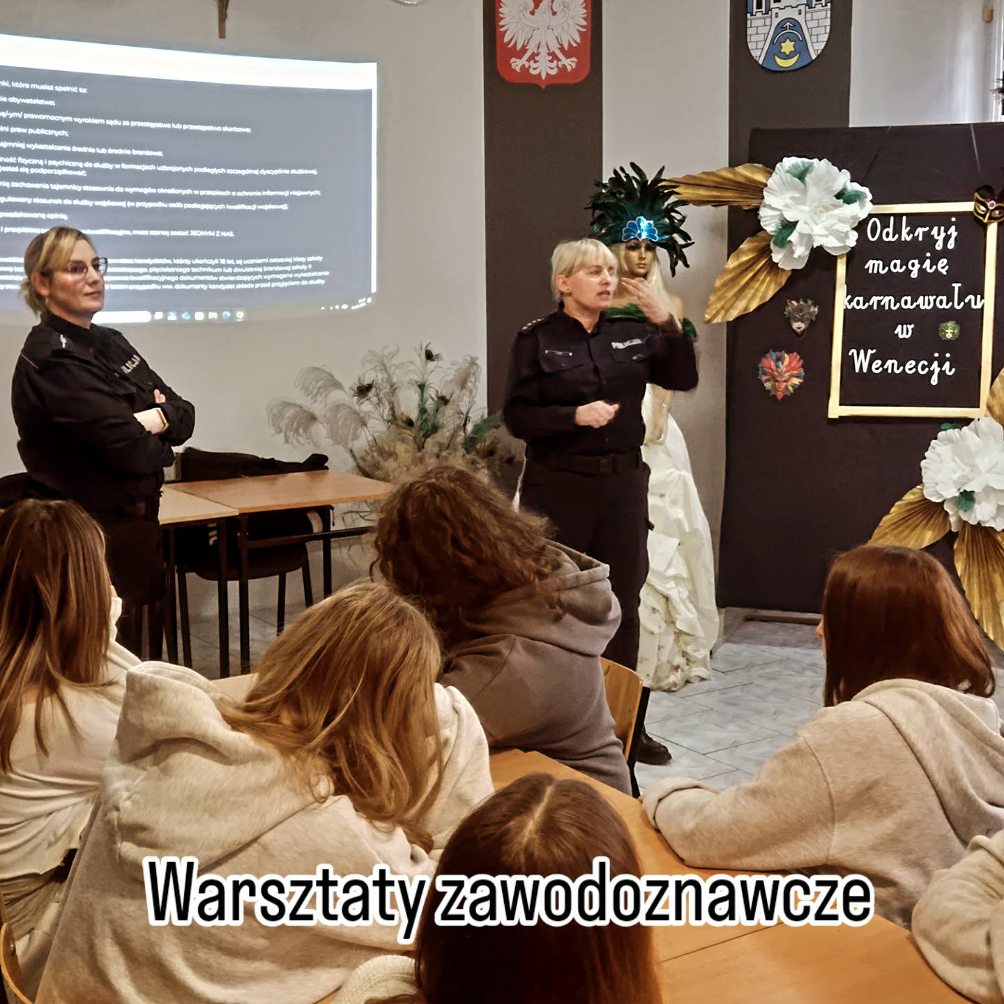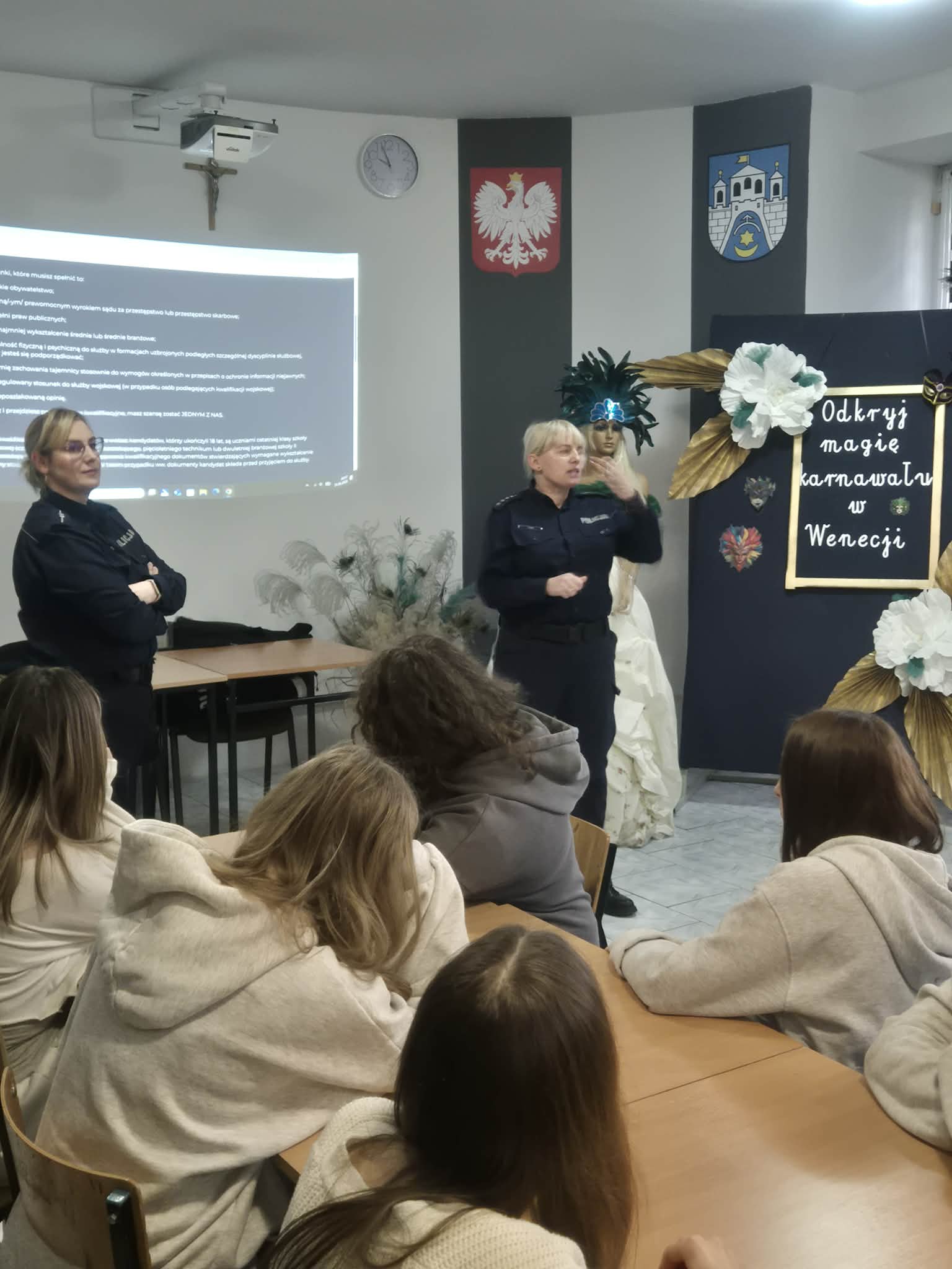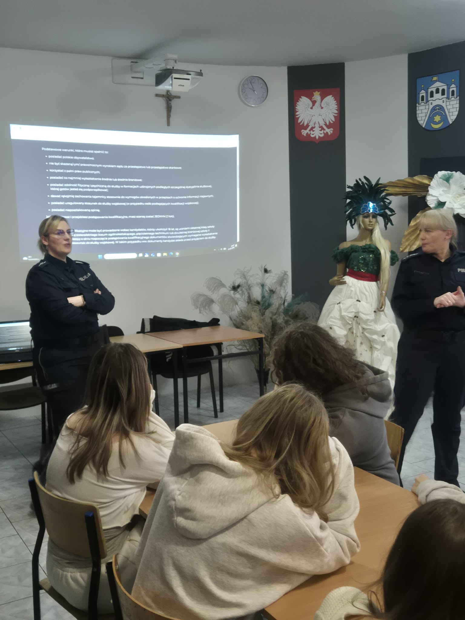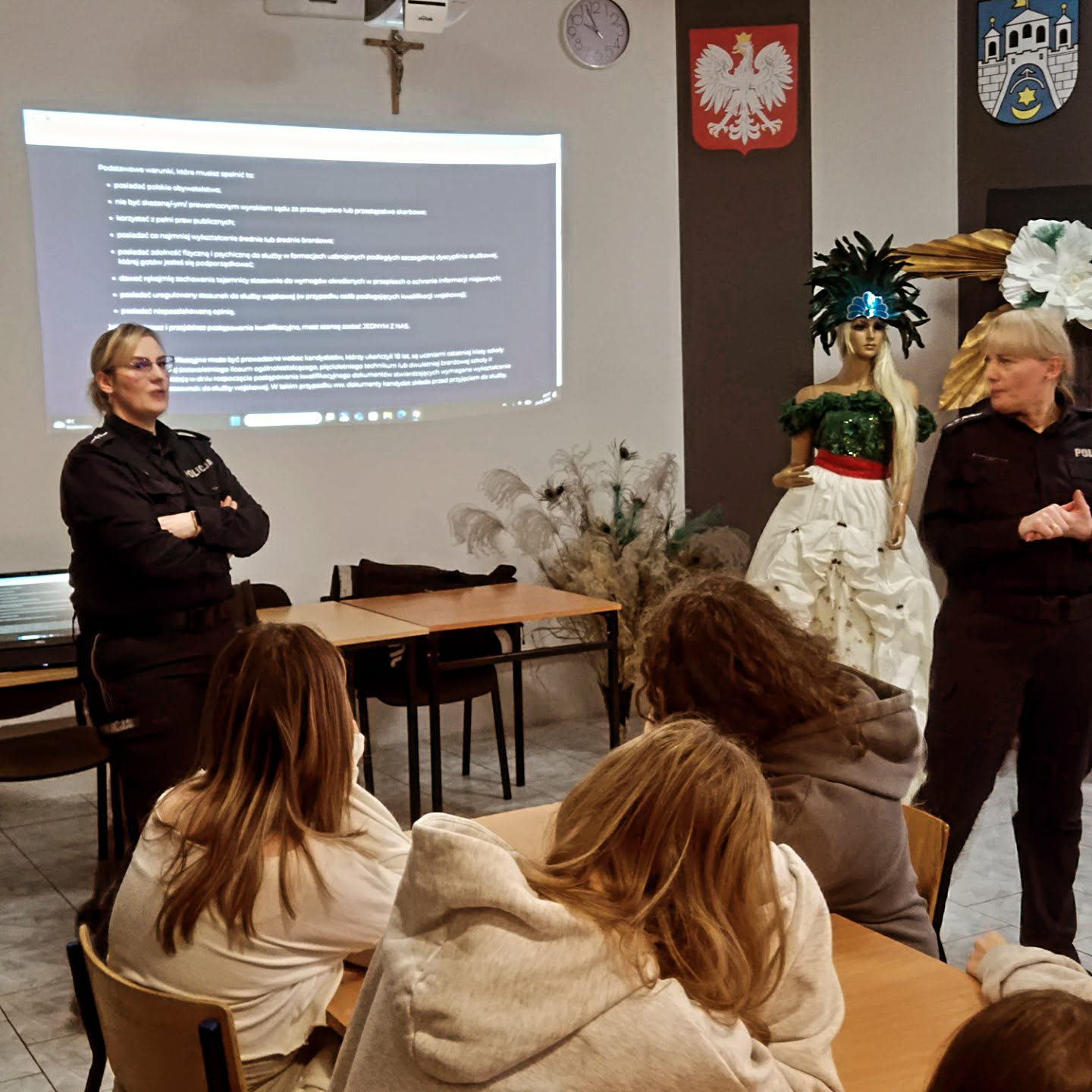 Podczas spotkania funkcjonariuszki szczegółowo omówiły proces naboru do Policji – od złożenia wymaganych dokumentów, przez test wiedzy i test sprawnościowy, aż po rozmowę kwalifikacyjną oraz badania psychologiczne i lekarskie. Uczniowie dowiedzieli się również, jak wygląda nauka w Wyższa Szkoła Policji w Szczytnie (obecnie Akademia Policji w Szczytnie) oraz jakie możliwości rozwoju zawodowego daje służba w Policji.